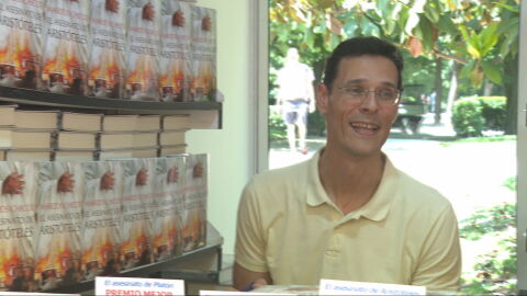 Podríamos decir que por fin sale de un encierro, cinco años le ha llevado escribir El asesinato de Aristóteles, para meterse en otro. Le encontrarán en la caseta 68 de la Feria del Libro de Madrid todos los días a todas las horas. Y lo hace por una buena causa: donar un euro por cada libro firmado a asociaciones que trabajan con personas con discapacidad.