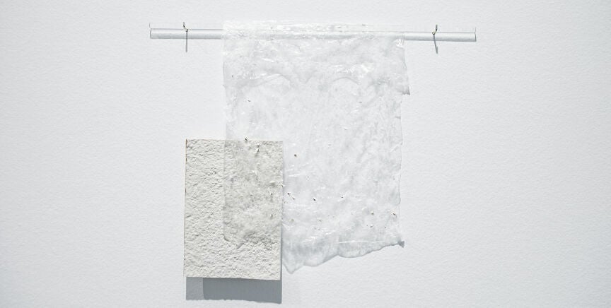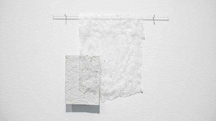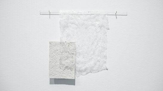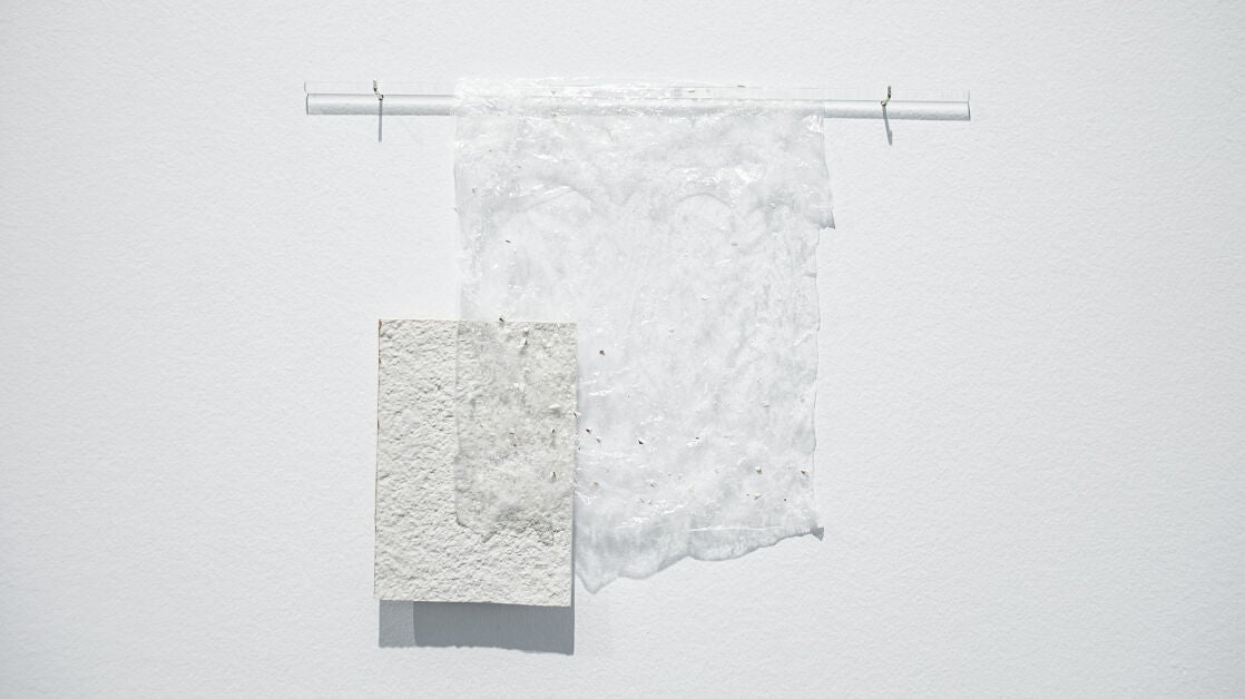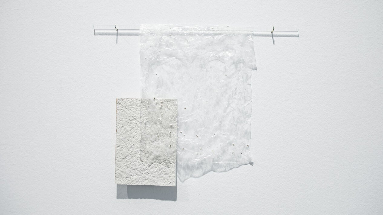 Lo que queda nació en los laboratorios del CICA, fruto de la colaboración entre la artista y dos grupos de investigación: UDCSólidos, especializados en química del estado sólido y en el desarrollo de nuevos materiales sostenibles para el almacenamiento de energía; y BioCost, dedicados a la biología costera y al estudio de los recursos marinos, incluidas las algas. De esa convivencia surgió una pieza formada por una lámina de porcelana parcialmente esmaltada, con el perfil lustrado en oro, cubierta por una película de alginato de sodio que sostiene fragmentos de porcelana desprendidos de una obra anterior, colgada como una sábana traslúcida de una varilla de vidrio de las que se usan en los laboratorios para preparar disoluciones.