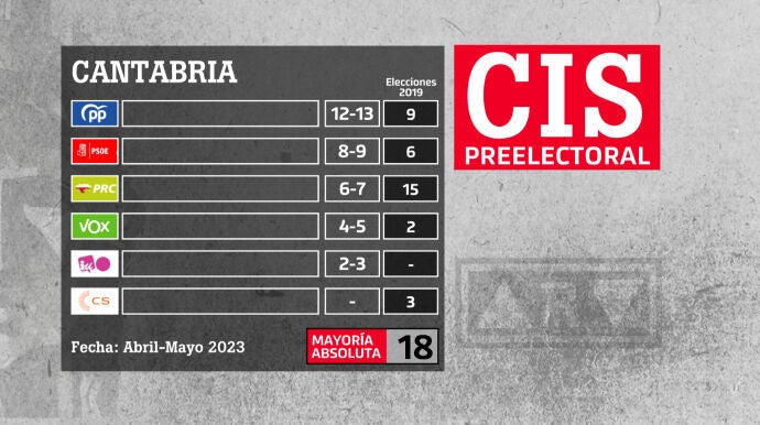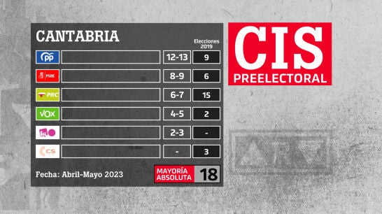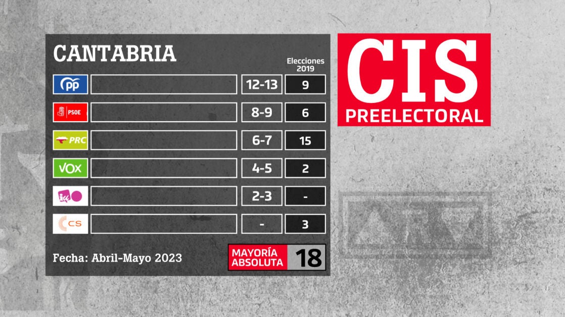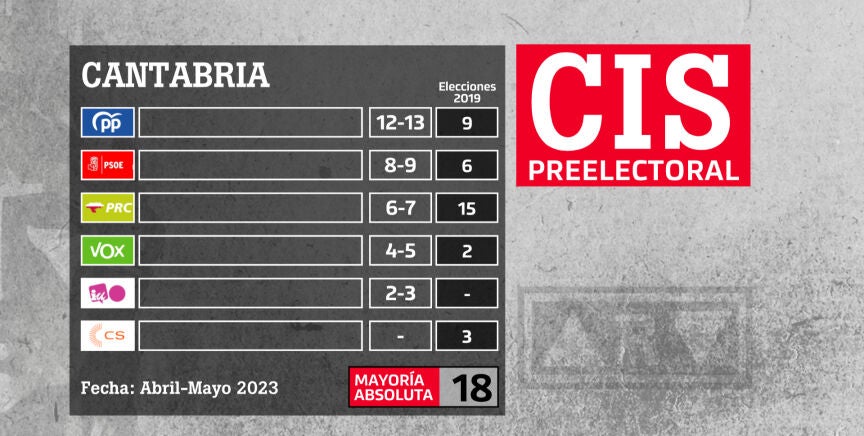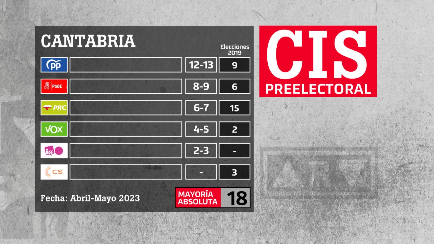 El PP ganaría las elecciones autonómicas en Cantabria el próximo 28 de mayo al obtener un 23,1% de los votos y entre 12 y 13 diputados, cifra que en 2019 fue de 9. También sumaría nuevos escaños el PSOE, formación que superaría al PRC con el 16,5% de votos y ocho o nueve escaños, según la encuesta publicada este jueves por el Centro de Investigaciones Sociológicas (CIS).