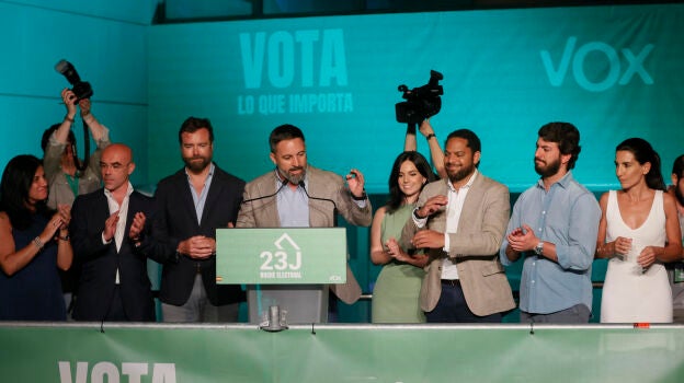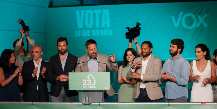 Santiago Abascal ha comparecido en torno a la medianoche ante los medios de comunicación. En primer lugar ha felicitado por su victoria al líder del PP, Alberto Núñez Feijóo, para arremeter contra él seguidamente. "Hemos alertado durante la campaña del peligro de unas encuestas claramente manipuladas que han llevado a algunos a vender la piel del oso antes de cazarlo, y que han tenido una clara consecuencia: la desmovilización", ha asegurado. Ha sacado pecho por mantenerse como tercera fuerza y ha lanzado un claro mensaje a sus cerca de tres millones de votantes: "No vamos a defraudarles; estamos preparados tanto para ser oposición como para una repetición electoral".