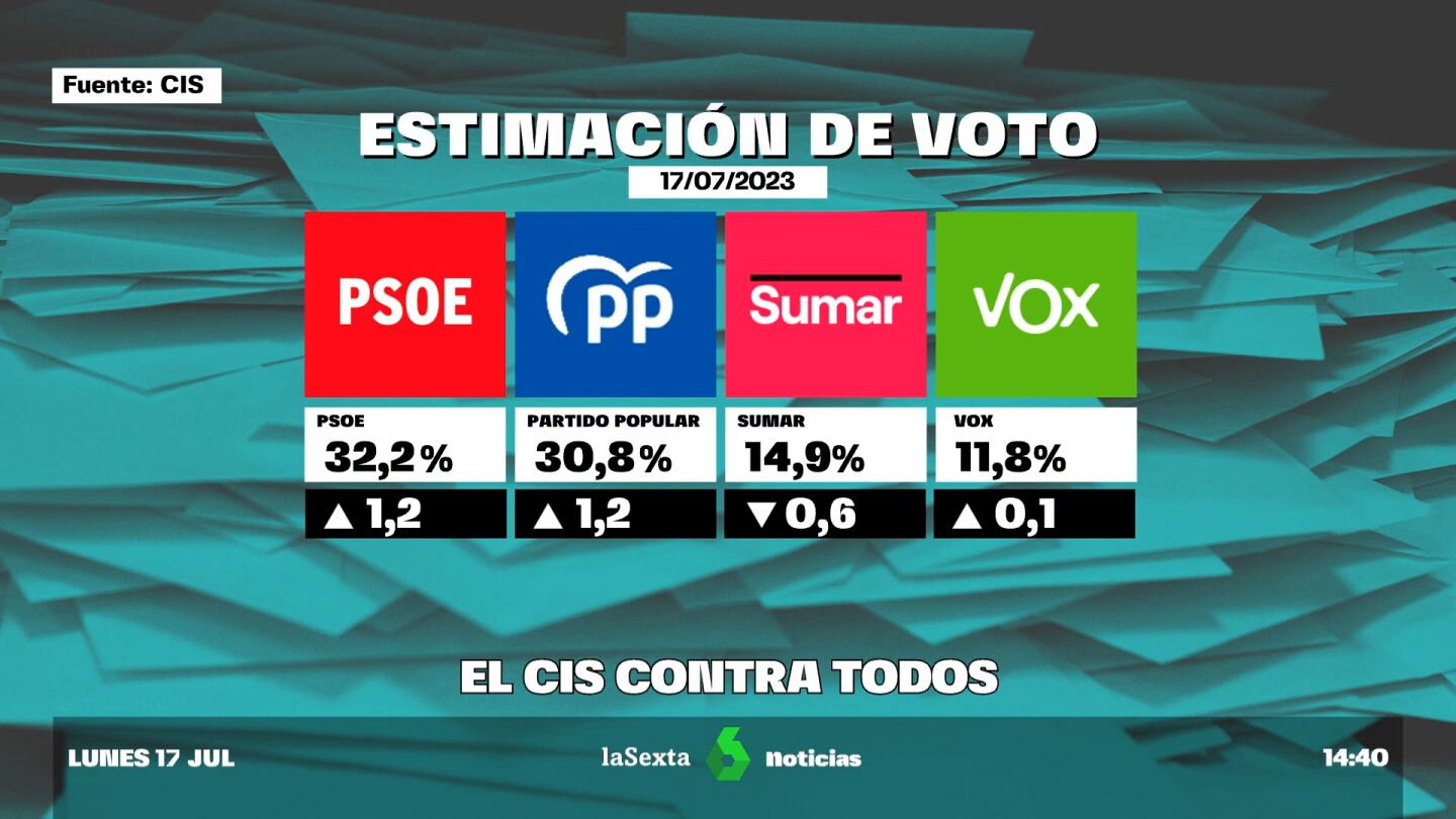 El Centro de Investigaciones Sociológicas publica un 'sondeo flash' sobre la intención de voto de cara al 23J, el último antes de que la ley impida publicar más encuestas sobre el escenario electoral de los próximos comicios.