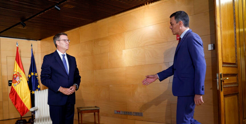 Feijóo ha hecho esta propuesta durante el encuentro que ha mantenido este miércoles con el presidente en funciones, que ha arrancado pasadas las 10:00 de la mañana y se ha prolongado algo menos de una hora. Una reunión con la que el líder del PP ha iniciado la ronda de contactos de cara a su debate investidura, que arrancará el 26 de septiembre.