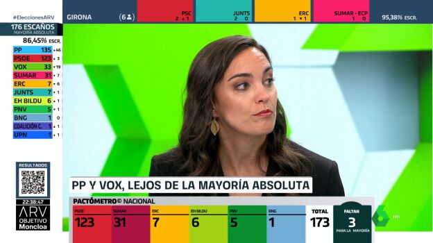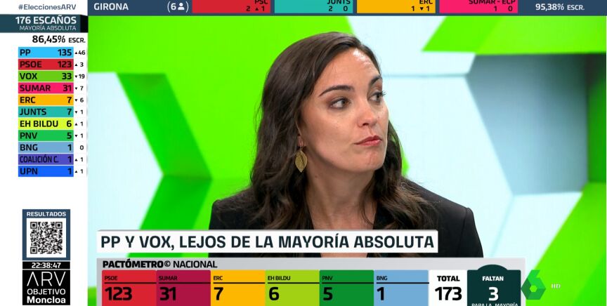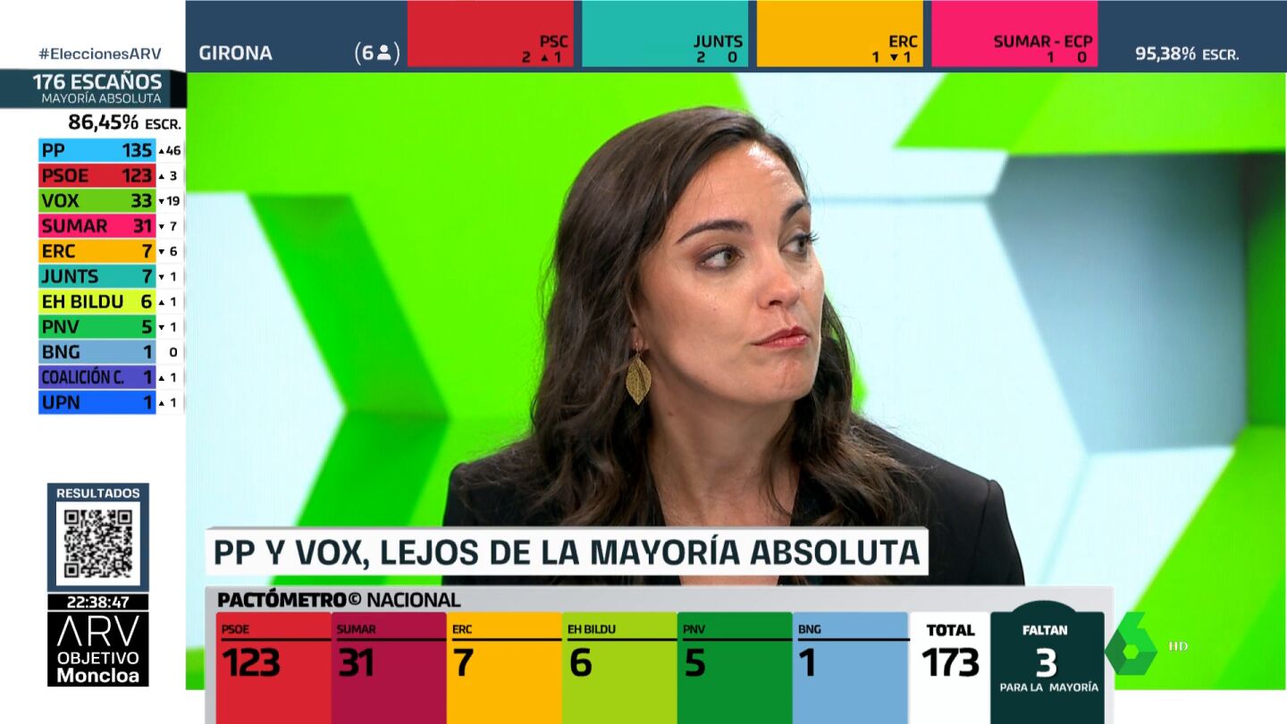 Esquerra, Junts y EH Bildu podrían ser clave para la formación del próximo Gobierno tras las elecciones generales del 23J, ya que las dos primeras formaciones han conseguido siete escaños este domingo, y la tercera seis. Pero, ¿podría llegar a haber ministros de estos partidos? La periodista Marta García Aller ha señalado en Al Rojo Vivo que "no sería del todo inverosímil tener ministros de ERC o Bildu". "No sería descartable que, en lugar, de cesiones, pidiesen ministerios, al igual que no lo descartábamos con Vox", ha manifestado García Aller.