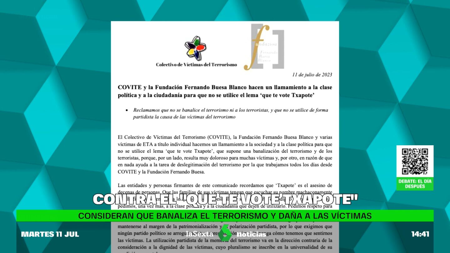 Covite, la Fundación Fernando Buesa Blanco y alrededor de una veintena de víctimas de ETA, a título individual, han realizado este martes un llamamiento a la clase política y a la sociedad para que no se utilice el lema 'Que te vote Txapote', al considerar que "supone una banalización del terrorismo y de los terroristas". Entre ellos, se encuentran familiares de concejales del PP José Ignacio Iruretagoyena y Manuel Zamarreño, asesinados por la organización terrorista.