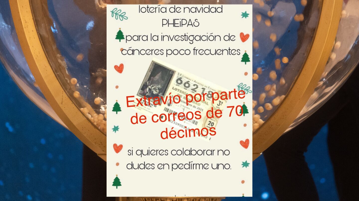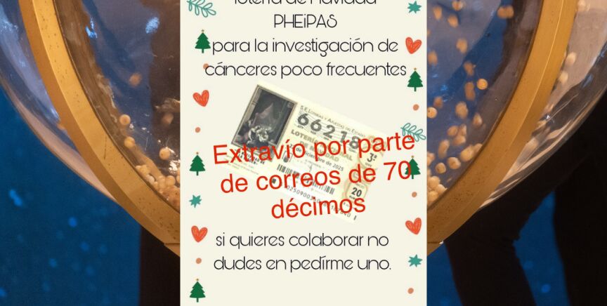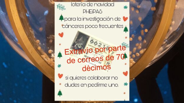 La asociación PHEiPAS, que busca mejorar el diagnóstico, tratamiento y calidad de vida de los pacientes diagnosticados con una serie de cánceres poco frecuentes, ha denunciado la desaparición de 70 décimos de la Lotería de Navidad que habían enviado por correo certificado a través de Correos y que nunca han llegado a su destino. PHEiPAS asegura que el envío se realizó el pasado 17 de septiembre, "certificado y asegurado", desde una oficina de Correos en Villajoyosa (Alicante), donde saben que fue clasificado, pero desde ahí "se perdió su pista". El destino: Masdenverg, en Tarragona, a donde nunca han llegado.