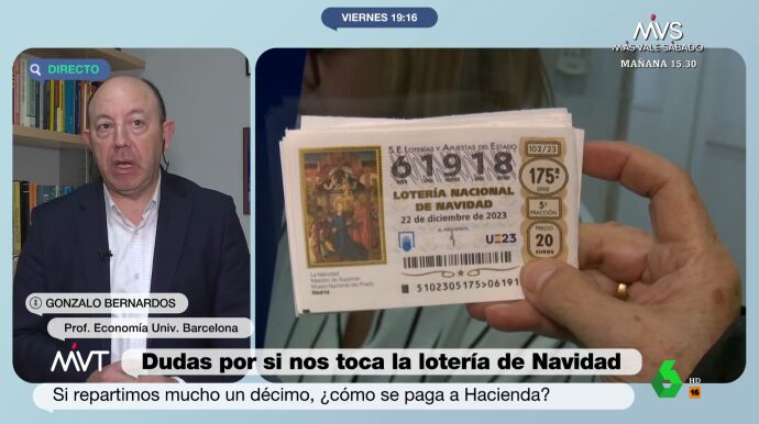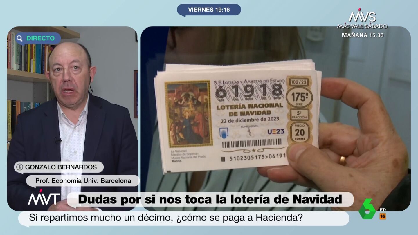 El economista Gonzalo Bernardos ha explicado en Más Vale Tarde cómo debemos proceder si nos toca la Lotería. "Si te toca el Gordo, Hacienda te deja 360.000 euros, de los que te quita el 20%, que son 72.000. De lo que te queda, si tienes el décimo repartido, os lo repartís y os olvidáis de todo", ha explicado el economista. El motivo reside en que "Hacienda ya se lo ha llevado a través de la retención". "No tenéis que hacer nada", ha reiterado.
