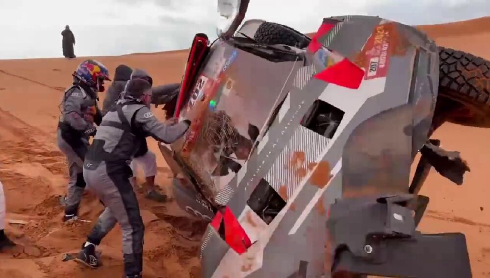 Si Joan Barreda decía adiós en el kilómetro 16, Carlos Sainz y Lucas Cruz no iban ni siquiera a poder pasar del kilómetro número 6. La pareja de Audi sufría un vuelco en una duna corta, de baja velocidad y tras clavar el morro del RS Q e-tron E2 en la arena. El coche daría una vuelta de campana frontal, terminando sobre el techo y obligando a que tanto el piloto madrileño, como el navegante catalán tuvieran que salir del vehículo a gatas, aunque ambos ilesos.