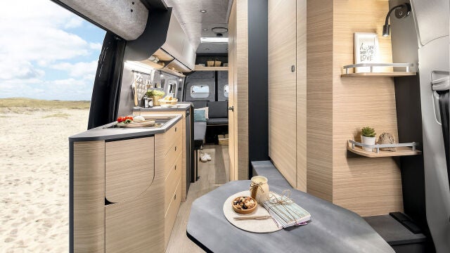 En el caso de que no tengas con quién compartir experiencias, puedes dejar un sofá en un lado del habitáculo y desplegar la cama en el otro, además de mantener una mesa central para trabajar mientras disfrutas de las vistas a través del portón trasero.