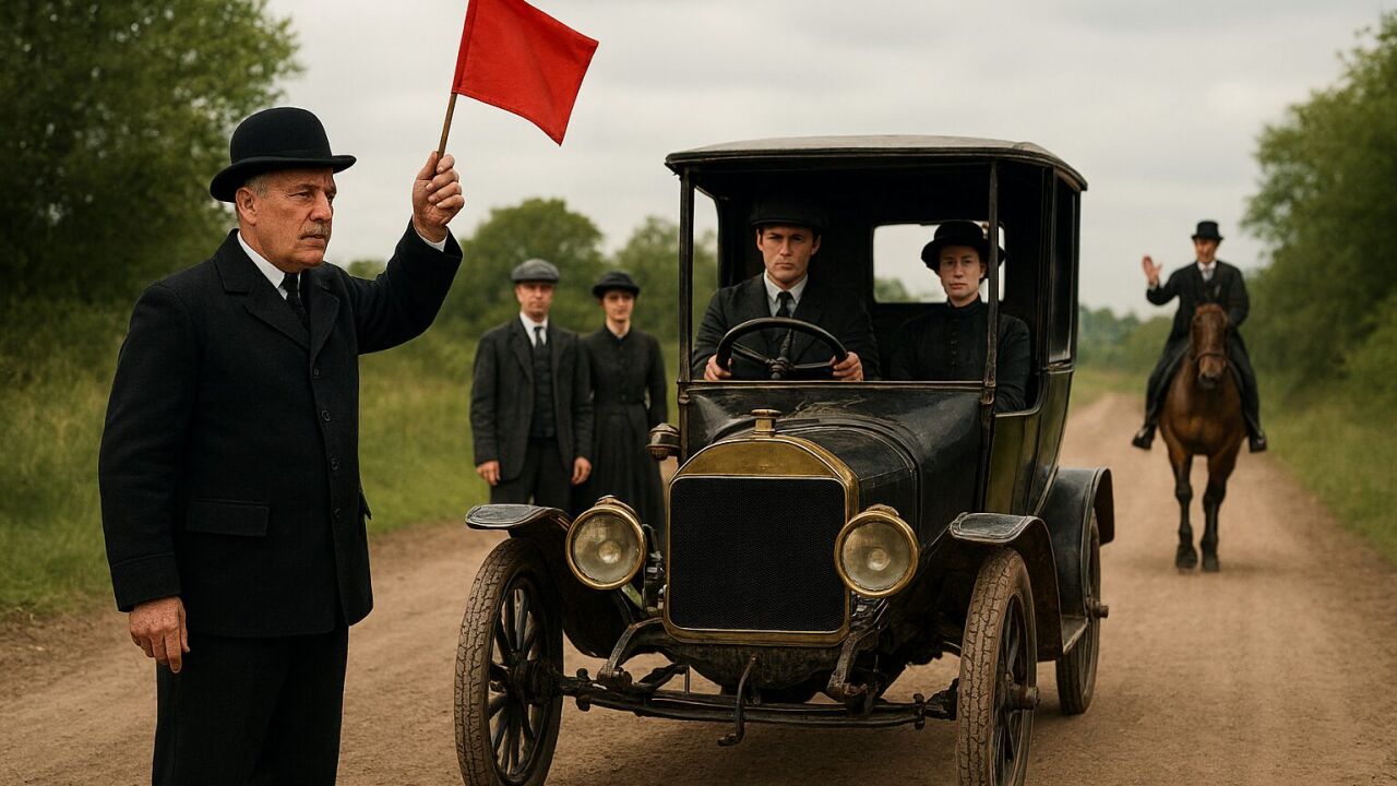 Imagina ir a por tu coche y descubrir que, por ley, necesitas contratar a tres personas adicionales para poder conducirlo legalmente. Una de ellas agitando un banderín, y que además, debes circular a 6 kilómetros por hora y si alguien con un caballo levanta la mano, estás obligado a detenerte inmediatamente. Para colmo de males, si tu motor hace demasiado ruido o asusta a algún animal, te arriesgas a una multa de proporciones bíblicas. Suena a ficción, pero fue la realidad en Inglaterra durante más de 30 años.