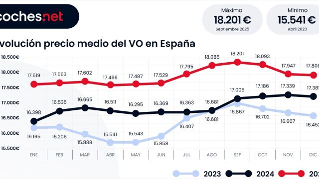 El precio medio del vehículo de ocasión mantuvo su tendencia alcista de los últimos años tras cerrar diciembre con un incremento interanual del 2,4% respecto a diciembre de 2024, situando el precio medio en 17.808 euros, según el barómetro mensual de coches.net.