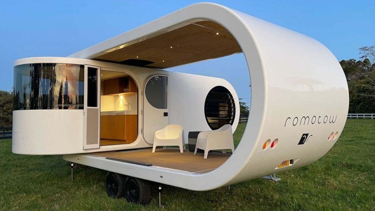 La nueva Romotow T8 es una caravana que gira y que tiene forma y diseño de USB. Este modelo cuenta con un chasis de acero y una estructura monocasco fabricada en aluminio. Tiene unas medidas de 9,3 m de largo, 3,35 m de alto y 2,45 m de ancho mientras se mantiene replegada, lo que la hace alcanzar los 3.400 kg de peso.