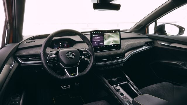 De serie, el Enyaq de acceso equipa llantas de 19 pulgadas, cuadro de mandos digital, pantalla multimedia digital de 13 pulgadas desde la que podemos acceder a la radio y un gran número de funciones y climatizador bizona - con un dato importante, la climatización se controla con mandos físicos ubicados en el centro de la consola central, a una altura perfecta para usarla de manera intuitiva sin apartar la mirada de la carretera. Este Enya de acceso viene de serie con retrovisores exteriores antideslumbrantes abatibles eléctricamente, faros LED, una gran cantidad de sistemas ADAS (el limitador de velocidad o el control de crucero son opcionales) y mucho más.