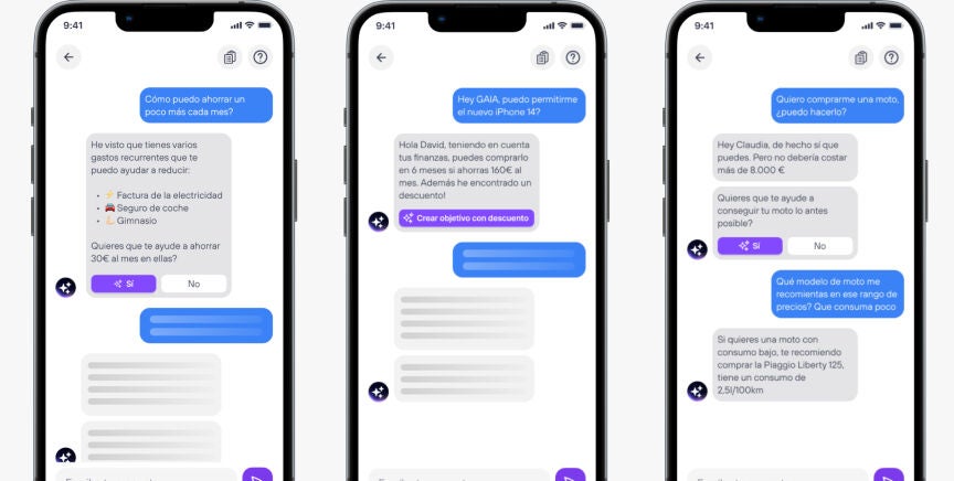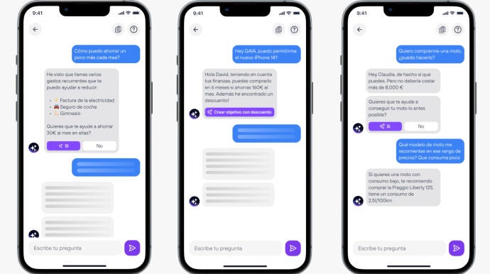 Lo que hace ahora GAIA es unir todos los servicios y funcionalidades que ya tenía. Ya no hace falta ni dar vueltas por la app. Solo tienes que preguntar a Gaia si te puedes comprar el coche, cuándo lo quieres tener y te dirá, como indica el ejemplo de arriba, cuánto tienes que ahorrar cada mes. Además, al estar conectada con tus cuentas, te ofrecerá reservar ese dinero de forma automática.