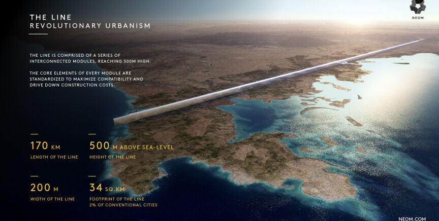 La ciudad del futuro está un poco más cerca de convertirse en una realidad. El príncipe Mohammed bin Salman de Arabia Saudí ha anunciado los planes para 'The Line', un proyecto urbanístico en medio del desierto que consistirá en una ciudad de apenas 200 metros de ancho... y 170 kilómetros de largo.
