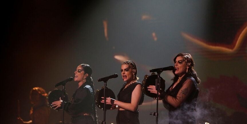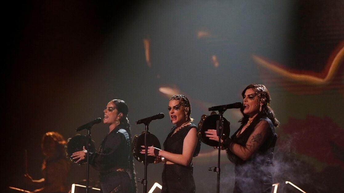 Las artistas, tres mujeres fuertes y valientes, han conquistado al público del Benidorm Fest con una impresionante puesta en escena, en la que sus espectaculares voces han brillado con letra en gallego, y han estado acompañadas del sonido de las panderetas de las 'Tanxugueiras'.
