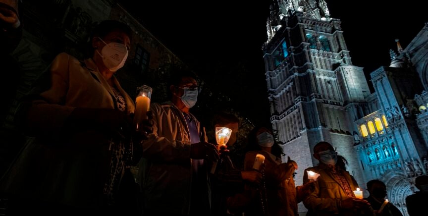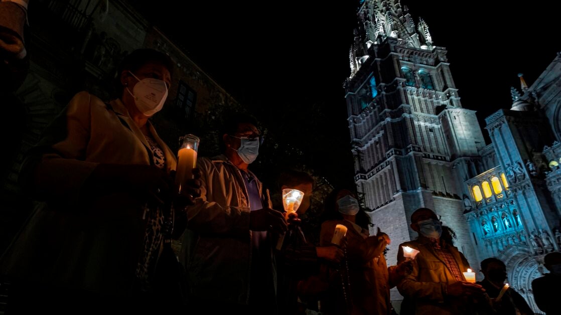 Una treintena de personas se han concentrado esta noche ante la catedral de Toledo con velas para rezar el rosario como "acto de reparación" tras la polémica surgida por elvideoclip de C. Tangana y Nathy Peluso en el interior del templo.