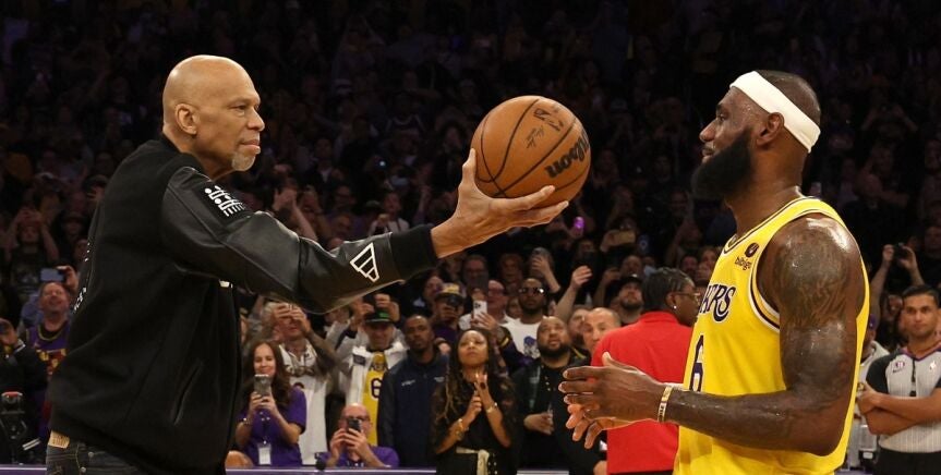En el medio de la pista, Kareem le hizo entrega de un balón a LeBron como símbolo de pasarle el testigo como máximo anotador de la NBA. Porque por primera vez en décadas, ya no lo será Kareem, sino que a partir de ahora el máximo anotar de la historia de la NBA es LeBron James.