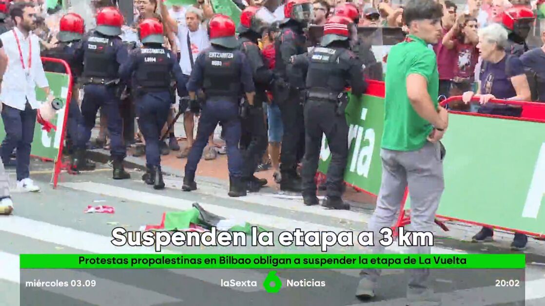 La Vuelta a España ha cancelado el final de la etapa de este miércoles por las protestas por la situación de Palestina en la línea de meta, en Bilbao. La organización ha comunicado que los tiempos no se tomarían en la línea de meta por motivos de "seguridad". Cientos de personas se concentraban en la zona con banderas de Palestina.