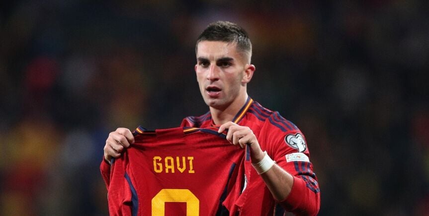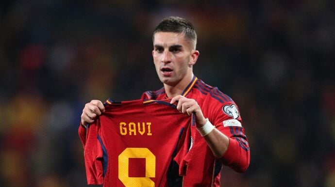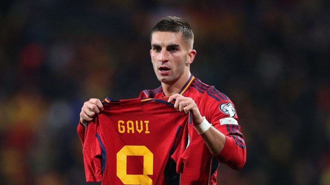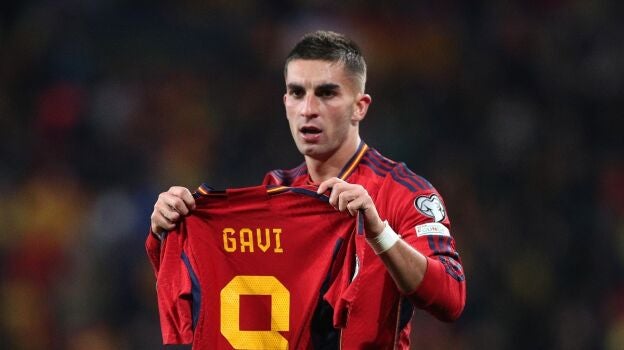 Ferran Torres mostró una camiseta de España con el dorsal 9 de Gavi tras anotar el gol que ponía por delante a la Selección ante Georgia. Se teme una lesión importante en la rodilla derecha del mediocentro.