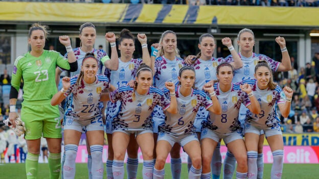 Y la foto de España, también especial. Especial porque posaron con un brazalete en sus muñecas. Nueve en la izquierda; dos en la derecha. Las once, con el brazo en alto y el puño cerrado para la imagen.