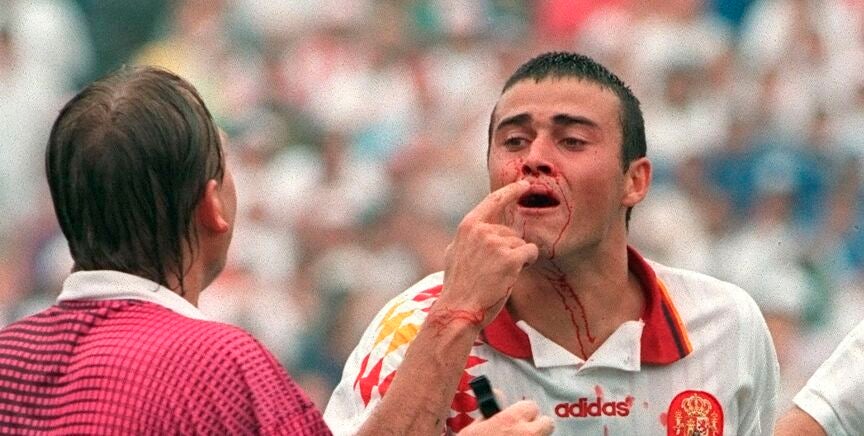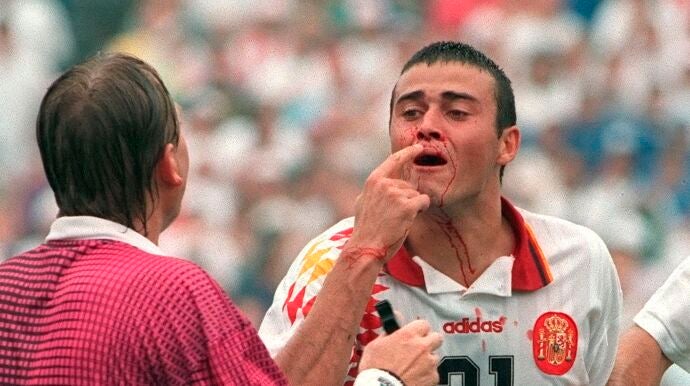 Una imagen que siempre será recordada por toda una generación de españoles: Luis Enrique sangrando en el Mundial de Estados Unidos de 1994. Tassotti le propinó un codazo... en una acción que no fue sancionada ni por el árbitro ni por el juez de línea.