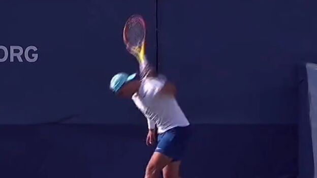 Tras un mal golpeo de derecha que se quedó en la red, Rafa hizo el gesto rabioso de estrellar la raqueta, pero finalmente se contuvo y prosiguió entrenando.