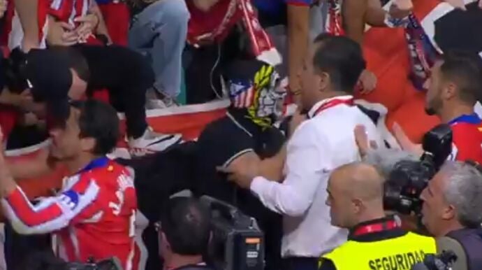Bochorno total en el Metropolitano. Ante el lanzamiento masivo de objetos, Koke y Giménez fueron al Fondo Sur a hablar con un 'aficionado' que estaba encapuchado y que por alguna razón estaba dentro del campo.