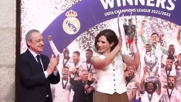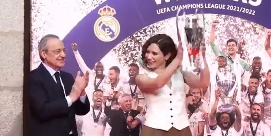 El Real Madrid se dio un baño de masas en las calles de la capital de España al comienzo de su rúa por la 14ª Champions League tras su victoria ante el Liverpool. Tras pasar por la Almudena, su siguiente parada fue la Puerta del Sol, en la Real Casa de Correos, donde están la sede de la Comunidad y donde esperaba Isabel Díaz Ayuso, presidenta, a quien entregaron una réplica de la 'Orejona'.