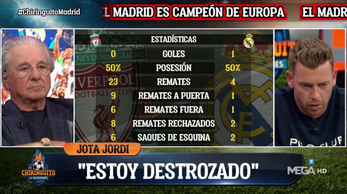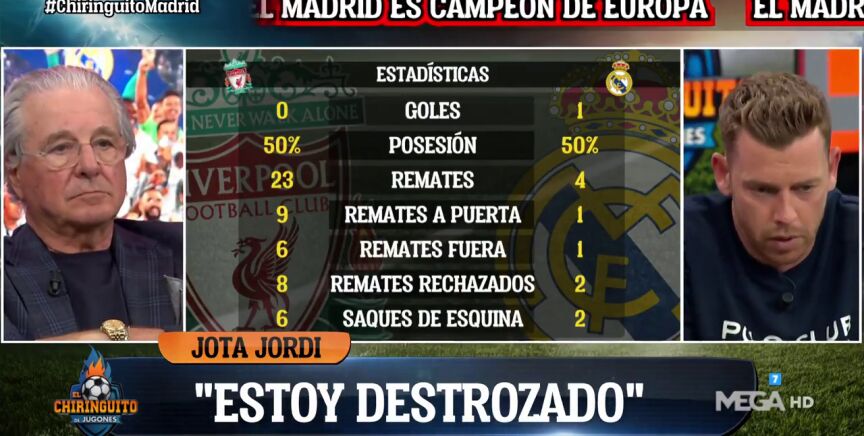 En 'El Chiringuito', Jota Jordi no le encontraba explicación a lo ocurrido: "Estoy cabreado, estoy hecho polvo. Estoy destrozado. Si hablamos de fútbol, el Madrid ha disparado una vez a puerta. Llevo un cabreo encima. Me tengo que rendir, porque me tengo que rendir".