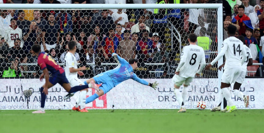 El Madrid se adelantó con el gol de Kylian Mbappé tras una carrera desde el centro del campo, pero a partir de ahí empezó el aserradero culé. Cuatro goles en la primera mitad. Más los que salvó Courtois. Que no fueron pocos.