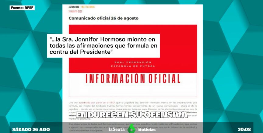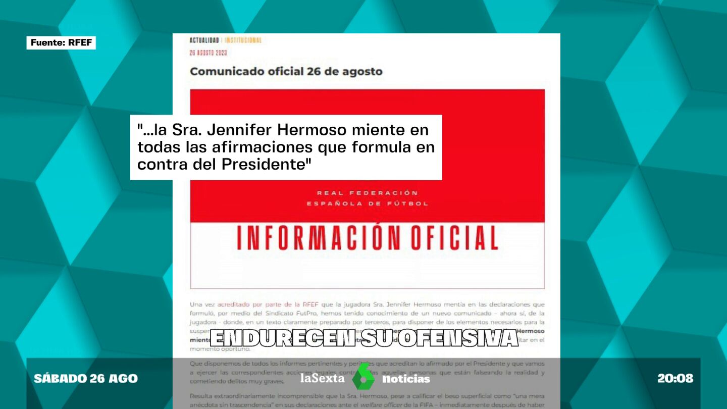 "Una vez acreditado por parte de la RFEF que Jennifer Hermoso mentía en sus declaraciones, por medio de FutPro, hemos tenido conocimiento de un nuevo comunicado ahora sí de la jugadora donde, en un texto claramente preparado por terceros, para disponer de los elementos necesarios para la suspensión de las funciones del presidente, debemos manifestar que Jennifer Hermoso miente", dicen.