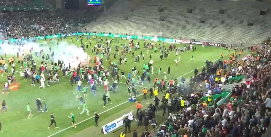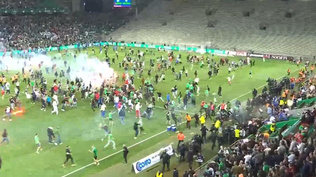 El caos, el descontrol y la violencia se adueñaron del césped del Estadio Geoffroy-Guichard una vez finalizado el último encuentro del playoff de descenso. El conjunto local del Saint-Étienne perdió en la tanda de penaltis y la próxima temporada disputará la segunda división francesa.