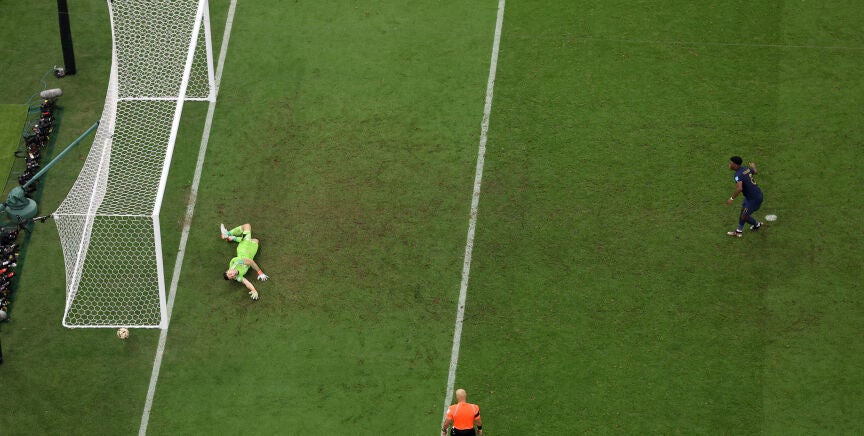 En la tanda de penaltis que iba a determinar el campeón, el jugador del Real Madrid tiró... y la mandó directamente fuera. Con ese fallo, Argentina lo tenía hecho para ser campeona y así habla del centrocampista el 'Dibu': "Cuando atajo el primer penal en una final del mundo, sé que el otro chico iba a estar muy nervioso, y le intenté jugar mentalmente tirándole la pelota lejos, hablándole".