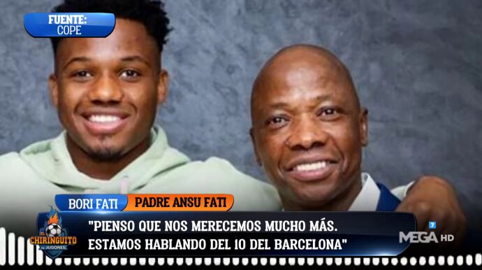 Conforme avanzaba la entrevista, Bori Fati se fue calentando y aseguró que ya no va al Camp Nou: "Si esto sigue así yo me voy a Sevilla, ya está. Al partido contra el Madrid no fui, porque no. Ahora mismo no voy al campo más. Tengo mi palco y no voy más. El otro día me preguntó Ansu que por qué no fui al campo, yo creía que estabas ahí viéndome, le dije que no tenía ganas".