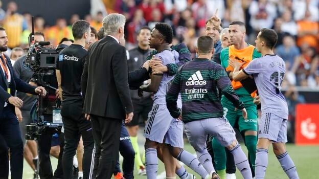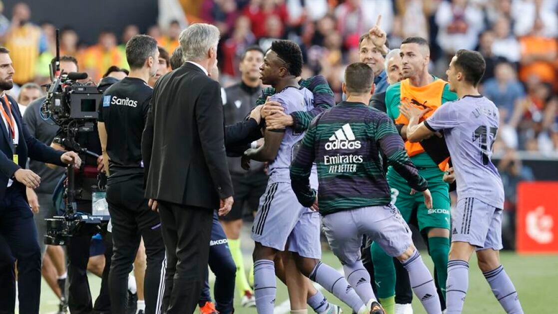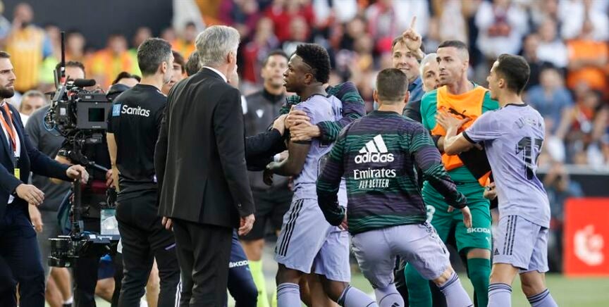 El Real Madrid criticó en un comunicado la acción de la expulsión de Vinícius en Valencia e instó a la RFEF a tomar medidas: "La gestión que se hizo por parte de los árbitros y del VAR no lo percibimos como algo aislado, sino como algo que se viene repitiendo en muchos de nuestros partidos. Nunca se puede hacer responsable del delito a la víctima que lo sufre".