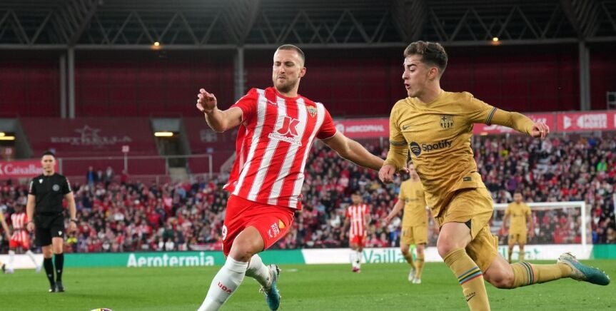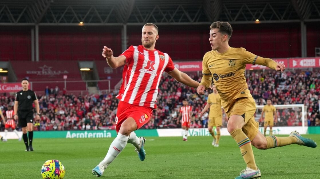 La acción de Rodrigo Ely parece limpia. Fue limpia, según el árbitro y también los encargados de la sala VOR. Sin embargo, Gavi no lo vio así y prefirió pararse y protestar que ir a impedir la jugada almeriense. O de, al menos, entorpecerla.