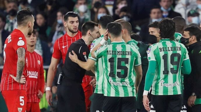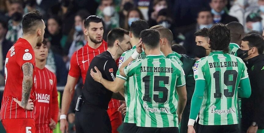 El Betis - Sevilla, gran derbi de la Copa del Rey, fue suspendido y aplazado para jugarse este domingo a puerta cerrada. El motivo, la agresión desde la grada a Joan Jordán, sevillista, que sufrió el impacto de una barra de plástico en su cabeza. El árbitro paró el partido, mandó a todos a la caseta y más tarde suspendió el partido.