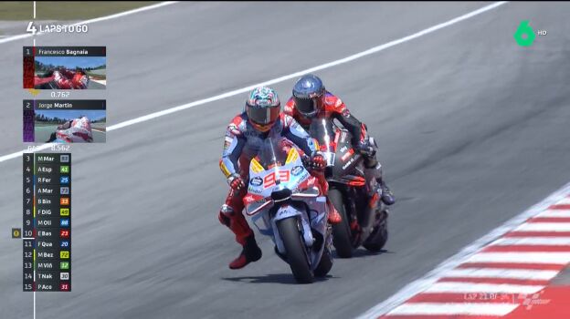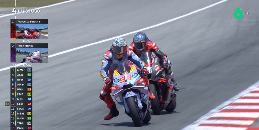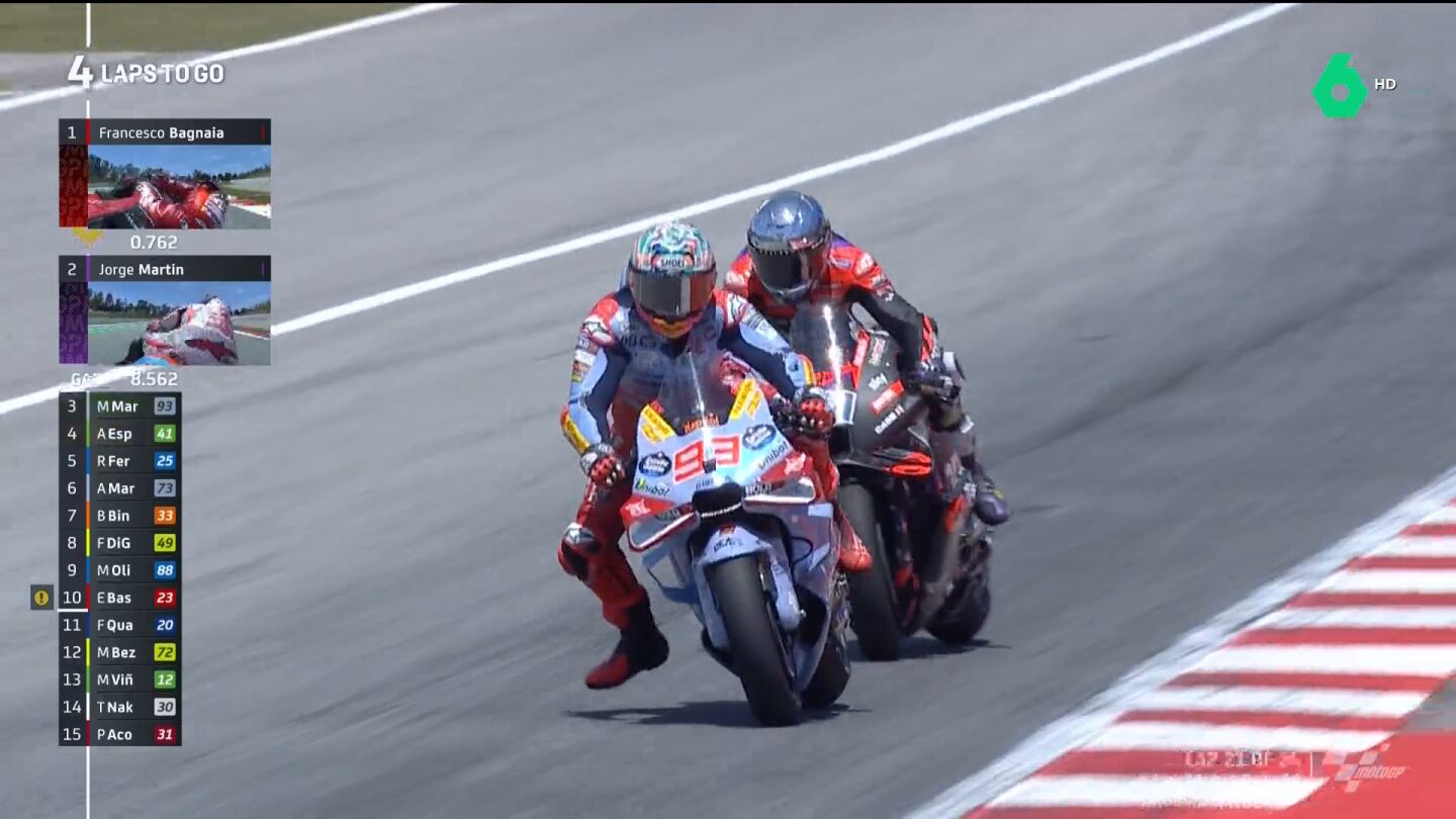 Marc Márquez hizo en la carrera larga de Catalunya lo mismo que en Le Mans y que en el sprint del sábado. El de Gresini salía 14º pero terminó en el podio con un adelantamiento final sobre Espargaró.
