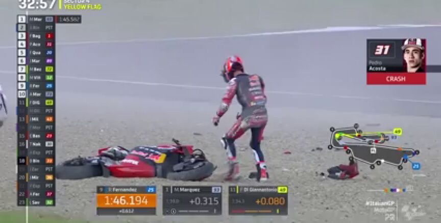 Pedro Acosta sufrió un durísimo accidente en el Gran Premio de Italia. El de Murcia, piloto del equipo GasGas, perdió por completo el control de su KTM y fue directo a la grava. Su moto, destrozada.