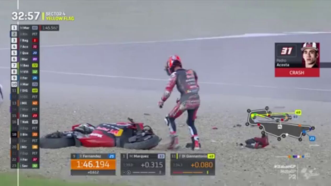 Pedro Acosta se fue al suelo en el GP de Italia. El de Murcia, en la curva 13, perdió la moto para terminar en la grava y terminar a contrarreloj la sesión. Al final, tercero.