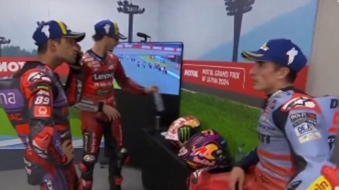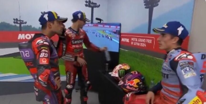 Acompañando en el podio a Bagnaia, han estado Marc Márquez (3º) y Jorge Martín (2º). Los tres han tenido una conversación de lo más curiosa antes de subirse a los tres escalones. En la sala en la que esperan han reaccionado a los momentos más importantes de la carrera.