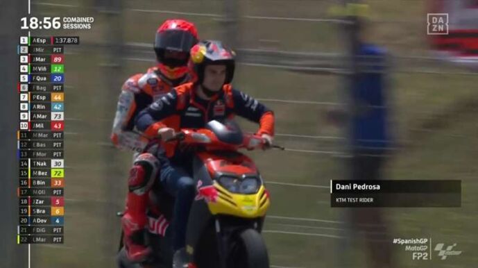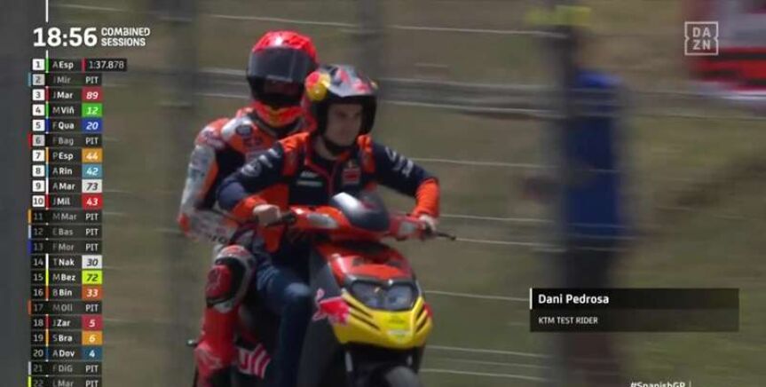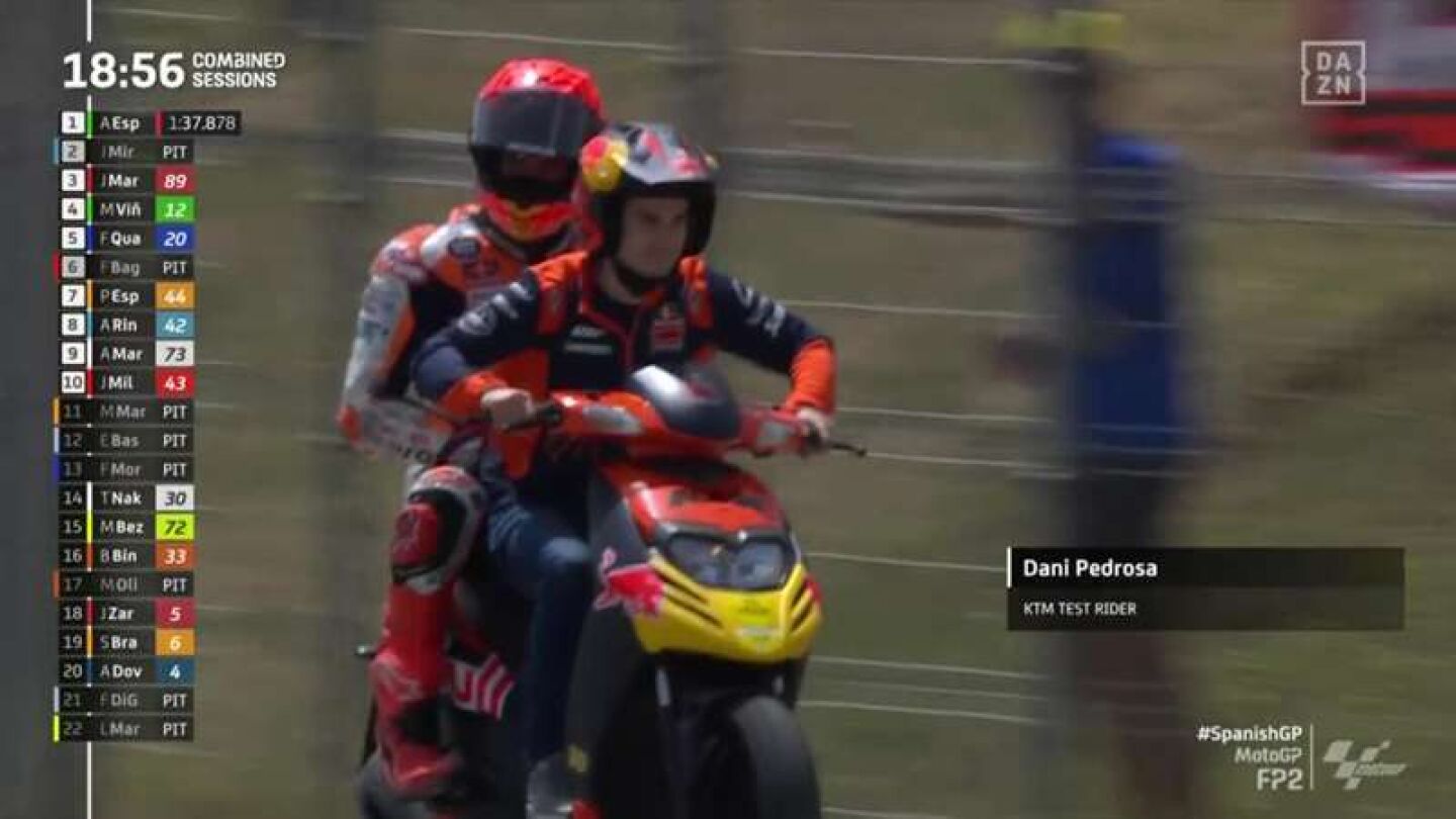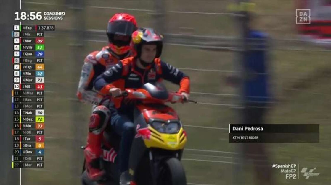 Porque un día formaron un equipo de ensueño en Honda 😍 Porque hoy son parte de la imagen del día en Jerez 🤩@26_DaniPedrosa recogiendo en scooter a @marcmarquez93 después de caerse y llevándolo de vuelta a su box. ¡No apto para nostálgicos! 🥰#SpanishGP 🇪🇸 #MotoGP 🏁 pic.twitter.com/JWyYdWUhQu