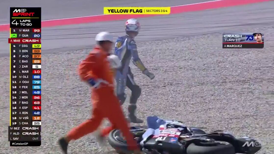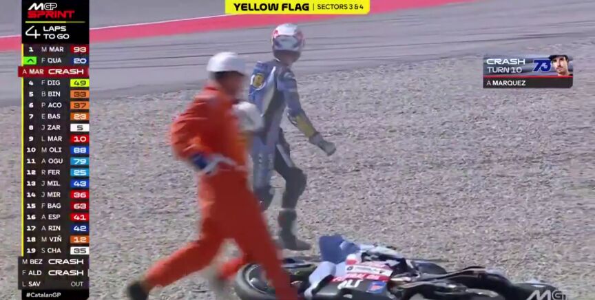 Sin embargo, cuando Álex le sacaba a su hermano casi un segundo y medio, se fue al suelo. Solo quedaban tres vueltas para el final y el de Gresini perdió el control de su moto en una curva. Los gestos de rabia de Álex tras una caída en la que no sufrió daños fueron evidentes.
