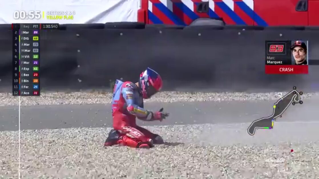 Marc Márquez se fue al suelo cuando peleaba la pole de Assen con Pecco Bagnaia. El catalán perdió el control de la moto y terminó en la grava para acabar con el séptimo crono de la sesión.