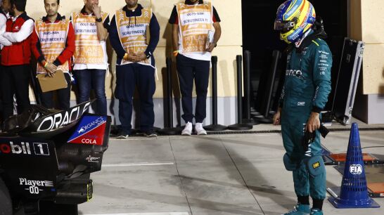 Al término del Gran Premio de Bahréin, después de bajarse del monoplaza, Fernando Alonso se fue directo a por el Red Bull de Max Verstappen.