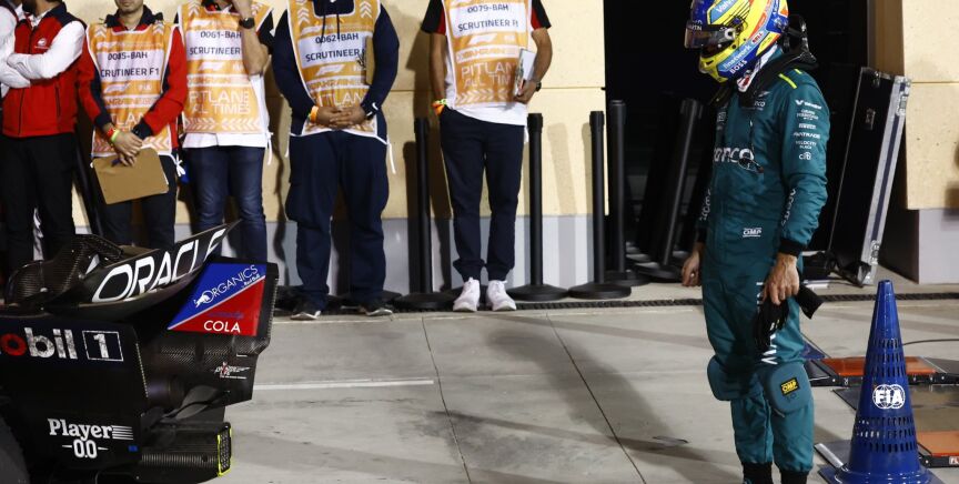 Tras bajarse del monoplaza después de quedar noveno en Sakhir, Fernando Alonso se fue directo a analizar la parte trasera del Red Bull RB20 de Max Verstappen.