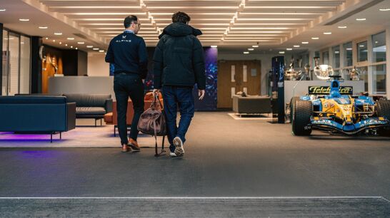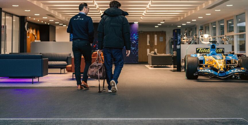 El piloto reserva de Alpine llega a la fábrica de Enstone haciéndose una foto con un coche histórico y muy reconocible de la escudería francesa.