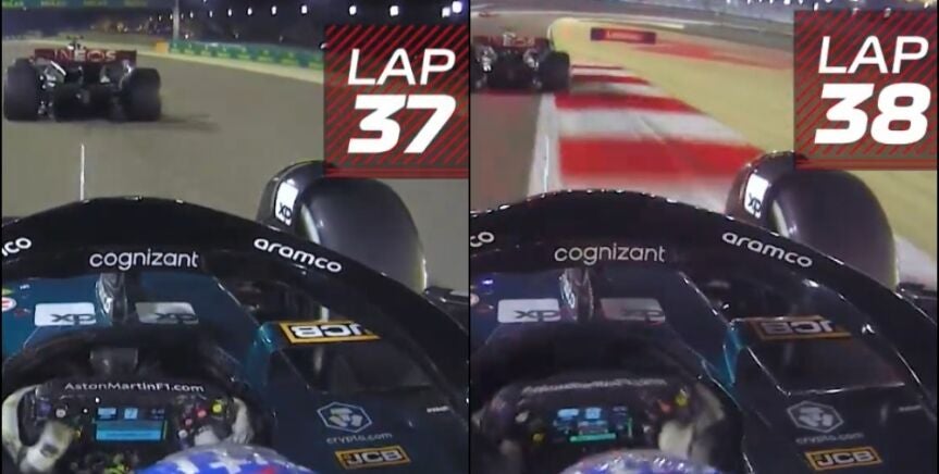 La Fórmula 1 ha publicado la grabación del doble adelantamiento del asturiano comparando la perspectiva que tenían en el monoplaza de Aston Martin y el de Mercedes en ambas vueltas.