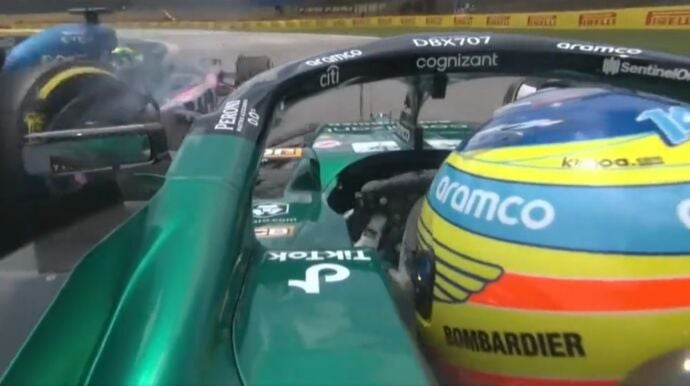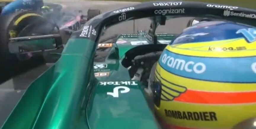 Alonso, pendiente del retrovisor, se hizo a un lado para dejar paso a su excompañero. En esas, Esteban toco el piano y perdió el control del coche golpeando el lado izquierdo del AMR23.