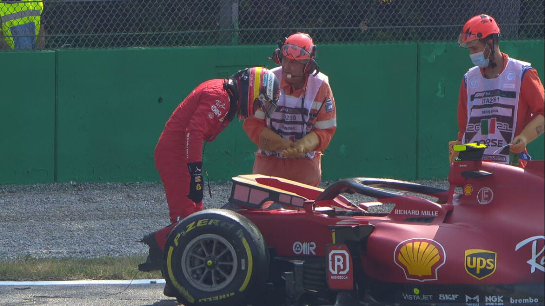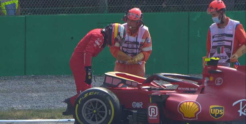 Carlos Sainz ha sufrido un accidente en la curva 9 del GP de Italia. En Ascari, el de Ferrari perdió el coche por completo y fue directo al muro. Ahora, a contrarreloj para llegar a la carrera al sprint.
